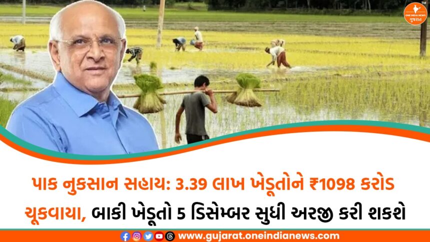 Reading: પાક નુકસાન સહાય : 3.39 લાખ ખેડૂતોને ₹1098 કરોડ ચૂકવાયા, બાકી ખેડૂતો 5 ડિસેમ્બર સુધી અરજી કરી શકશે