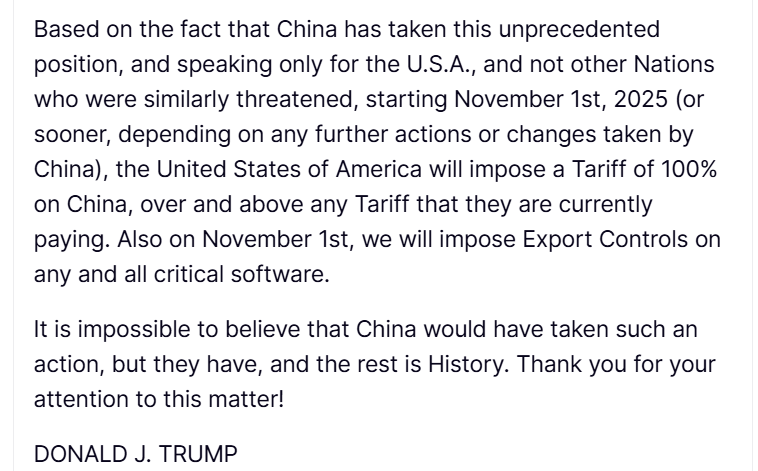 ટ્રમ્પે જણાવ્યું કે અન્ય દેશો આ ધમકી વિરુદ્ધ બોલે કે ન બોલે, અમેરિકા પોતે નિર્ણાયક પગલાં લેશે. તેમણે કહ્યું કે ચીનની બધી જ વસ્તુઓ પર હાલના ટેરિફ સિવાય વધારાનો 100% ટેરિફ લાગુ કરવામાં આવશે. જો ચીને વધુ કોઈ આક્રમક પગલું લીધું તો આ ટેરિફ નિર્ધારિત સમય કરતાં પહેલાં પણ લાગુ થઈ શકે છે. સાથે જ ટ્રમ્પે ચેતવણી આપી કે અમેરિકા 1 નવેમ્બરથી તમામ મહત્વપૂર્ણ સોફ્ટવેર અને ટેકનોલોજી નિકાસ પર પણ કડક નિયંત્રણો લાદશે, જેથી ચીનને અમેરિકન ટેકનોલોજી અને ઈન્ટેલેક્ચ્યુઅલ પ્રોપર્ટીનો લાભ ન મળે.