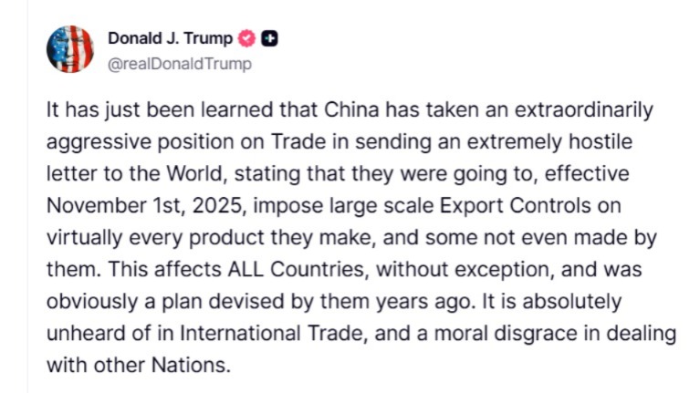 ટ્રમ્પે આ નિર્ણયની જાહેરાત પોતાના સોશિયલ મીડિયા પ્લેટફોર્મ ટ્રુથ સોશિયલ પર કરી હતી. તેમણે પોસ્ટમાં જણાવ્યું કે ચીને વેપાર અંગે “અતિ આક્રમક” વલણ અપનાવ્યું છે અને વિશ્વને એક સત્તાવાર પત્ર મોકલ્યો છે, જેમાં તેણે 1 નવેમ્બર 2025થી લગભગ તમામ એવા ઉત્પાદનો પર નિકાસ નિયંત્રણ લાદવાની જાહેરાત કરી છે, જે ચીનમાં બનેલા નથી. ટ્રમ્પના જણાવ્યા અનુસાર, ચીનનું આ પગલું વિશ્વના મોટા ભાગના દેશોને સીધી અસર કરશે અને વૈશ્વિક વેપાર વ્યવસ્થામાં અસ્થિરતા લાવશે. તેમણે જણાવ્યું કે ચીન વર્ષોથી આ નીતિ અમલમાં મૂકવાનું આયોજન કરી રહ્યું હતું, પરંતુ હવે તે ખુલ્લેઆમ તેની જાહેરાત કરી રહ્યો છે — જે, તેમના મતે, આંતરરાષ્ટ્રીય વેપાર માટે એક નૈતિક અપમાન સમાન છે.