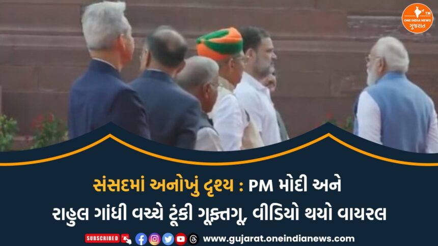 One India News > News > Gujarat > સંસદમાં અનોખું દૃશ્ય : PM મોદી અને રાહુલ ગાંધી વચ્ચે ટૂંકી ગૂફ્તગૂ, વીડિયો થયો વાયરલ