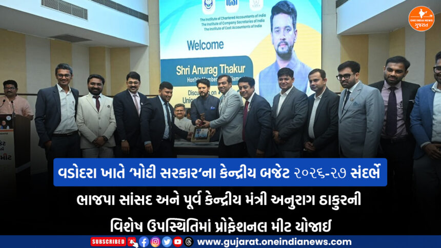 ગુજરાત પ્રદેશ ભાજપા મીડિયા વિભાગની અખબારી યાદી જણાવે છે કે, ‘મોદી સરકાર‘ના કેન્દ્રીય બજેટ ૨૦૨૬-૨૭ સંદર્ભે ભારતીય જનતા પાર્ટીના સાંસદ અને પૂર્વ કેન્દ્રીય મંત્રી અનુરાગ ઠાકુરની વિશેષ ઉપસ્થિતિમાં આજે વડોદરા ખાતે પ્રોફેશનલ મીટ યોજાઈ હતી. શહેરના આઇ.સી.એ.આઈ. ભવન ખાતે આયોજિત આ કાર્યક્રમમાં શહેરના અગ્રણી ઉદ્યોગકારો, ચાર્ટડ એકાઉન્ટન્ટસ, વિવિધ ક્ષેત્રના પ્રોફેશનલ્સ અને પ્રબુદ્ધ નાગરિકો સમ્મિલિત થયા હતાં.