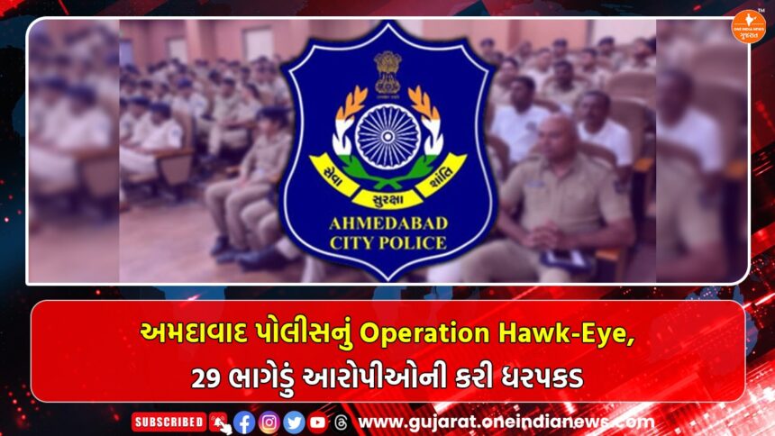 અમદાવાદ શહેરમાં ગુનાહિત પ્રવૃત્તિઓ પર કડક પ્રહાર કરતા શહેર પોલીસ દ્વારા એક મોટી અને મહત્વપૂર્ણ સફળતા હાંસલ કરવામાં આવી છે. અમદાવાદ શહેર પોલીસ ઝોન-7 દ્વારા હાથ ધરાયેલા ખાસ “Operation Hawk-Eye” અંતર્ગત લાંબા સમયથી ફરાર રહેલા કુલ 29 ભાગેડુ આરોપીઓની ધરપકડ કરવામાં આવી છે. આ તમામ આરોપીઓ શહેરના વિવિધ પોલીસ મથકોમાં નોંધાયેલા કુલ 26 ગંભીર ગુનાહિત કેસોમાં સંડોવાયેલા હોવાનું સામે આવ્યું છે, જેના કારણે તેઓ લાંબા સમયથી કાયદાની પકડથી બચી રહ્યા હતા.