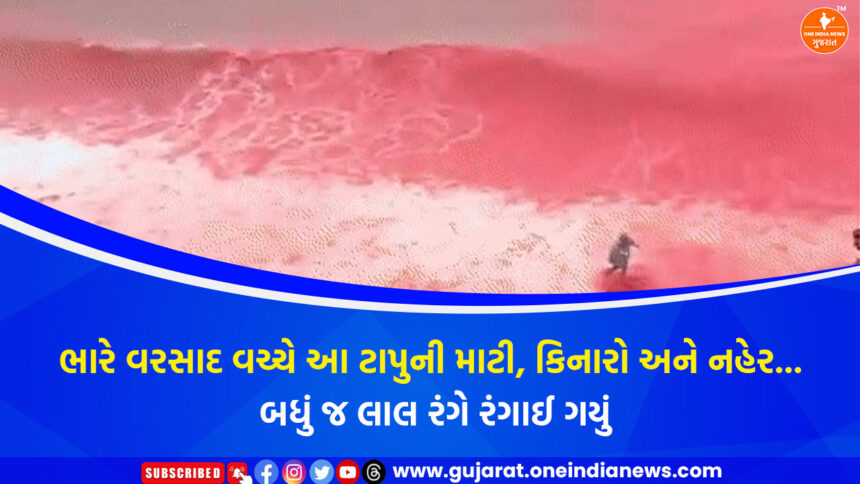 ઈરાનના હોર્મુઝ દ્વીપ પર ભારે વરસાદ બાદ એક અદ્ભુત અને થોડીક ડરામણી લાગતી પ્રાકૃતિક ઘટના સામે આવી છે, જેમાં દ્વીપના વિશ્વપ્રસિદ્ધ રેડ બીચ પર વરસાદનું પાણી અને દરિયાના મોજા ઘાટા લાલ રંગના થઈ ગયા છે. સોશિયલ મીડિયા પર વાયરલ થયેલા વીડિયોમાં સ્પષ્ટ દેખાઈ રહ્યું છે કે ચટ્ટાનોમાંથી લાલ રંગનું પાણી વહેતા વહેતા સીધું દરિયામાં ભળી રહ્યું છે, જેના કારણે આખો બીચ અને આસપાસનું સમુદ્ર ક્રિમસન અથવા લોહી જેવો લાલ રંગ ધારણ કરી લે છે.