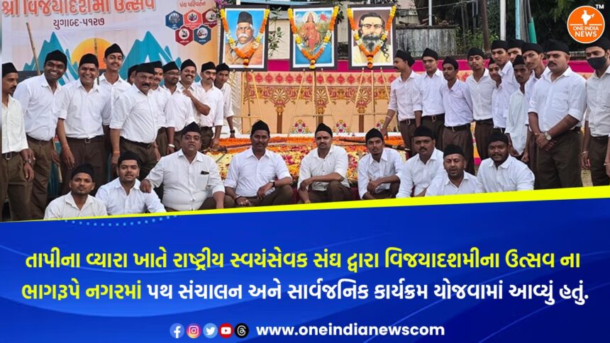 રાષ્ટ્રીય સ્વયંસેવક સંઘ ની સ્થાપના 1925 માં વિજયાદશમી ના દિને થઈ હતી અને હવે રાષ્ટ્રીય સ્વયંસેવક સંઘ તેની 100 વર્ષ ની સફર તરફ આગળ વધી રહ્યું છે ત્યારે સમગ્ર દેશ સહિત તાપી જિલ્લામાં પણ તેની સંઘ શતાબ્દી વર્ષ તરીકે ઉજવણી કરવામાં આવી રહી છે તાપી જિલ્લાના તમામ તાલુકામાં RSS દ્વારા પથ સંચાલન યોજાઈ રહ્યું છે. ત્યારે વ્યારા નગરના સયાજી મેદાન ખાતે થી રાષ્ટ્રીય સ્વયંસેવક સંઘનુ પથ સંચાલન નગરના મુખ્ય માર્ગો પર નીકળતા નગરમાં પથ સંચાલન આકર્ષણનું કેન્દ્ર બન્યું હતું ત્યારબાદ સંઘ દ્વારા સયાજી મેદાન ખાતે એક સાર્વજનિક કાર્યક્રમ યોજવામાં આવ્યો હતો જેમાં નગરના સંઘના મોટી સંખ્યામાં સ્વયંસેવકો સહિત નગરનાં પ્રબુદ્ધ નાગરિકો ઉપસ્થિત રહ્યાં હતાં.