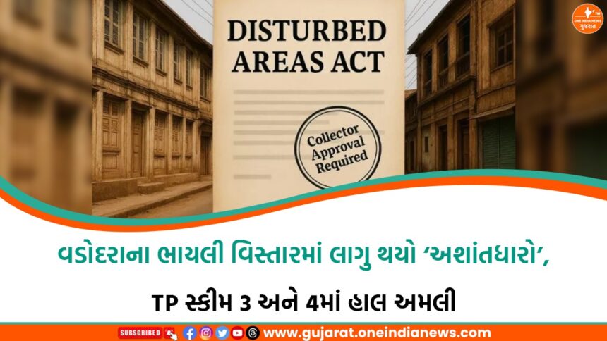 ગુજરાત સરકારે વડોદરા જિલ્લાના ભાયલી વિસ્તારમાં ‘ડિસ્ટર્બ્ડ એરિયાઝ એક્ટ’ (અશાંતધારા) લાગુ કરવાનો મહત્વપૂર્ણ નિર્ણય લીધો છે. હાલ આ કાયદો ડભોઈ વિધાનસભા ક્ષેત્ર હેઠળ આવતી ટાઉન પ્લાનિંગ (TP) સ્કીમ 3 અને 4માં અમલમાં મૂકવામાં આવ્યો છે.