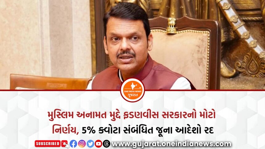 મહારાષ્ટ્રની દેવેન્દ્ર ફડણવીસ સરકારે મુસ્લિમ અનામત અંગે એક મહત્વપૂર્ણ અને ચર્ચાસ્પદ નિર્ણય લીધો છે. રાજ્યના સામાજિક ન્યાય વિભાગે 17 ફેબ્રુઆરી 2026ના રોજ નવો Government Resolution (GR) જાહેર કરીને મુસ્લિમ સમુદાયને મળતા 5% શૈક્ષણિક અનામત સંબંધિત તમામ જૂના આદેશો અને પરિપત્રોને સત્તાવાર રીતે રદ કરી દીધા છે. આ નિર્ણય બાદ હવે આ શ્રેણીના વિદ્યાર્થીઓને કોલેજો અને અન્ય શૈક્ષણિક સંસ્થાઓમાં 5% અનામત હેઠળ પ્રવેશ મળશે નહીં તેમજ નવા જાતિ પ્રમાણપત્રો અથવા માન્યતા પ્રમાણપત્રો પણ જારી કરવામાં આવશે નહીં.