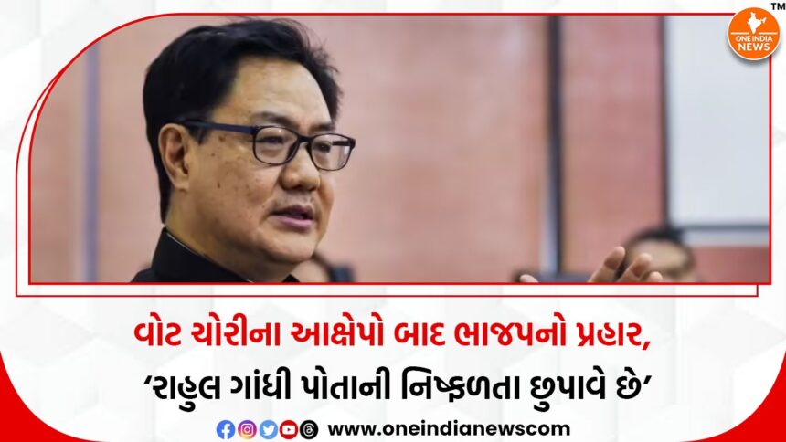 હરિયાણા વિધાનસભા ચૂંટણીમાં ‘વોટ ચોરી’ના આરોપ લગાવ્યા બાદ ભાજપે કોંગ્રેસ નેતા રાહુલ ગાંધી પર પ્રત્યુત્તરાત્મક પ્રહાર કર્યો છે. ભાજપના વરિષ્ઠ નેતા અને પૂર્વ કેન્દ્રીય મંત્રી કિરેન રિજિજૂએ રાહુલ ગાંધીના આક્ષેપોને “નિષ્ફળતા છુપાવવાનો પ્રયાસ” ગણાવ્યો છે. રિજિજૂએ જણાવ્યું કે રાહુલ ગાંધી સતત જનતા સામે પોતાના હારના બહાના શોધે છે. તેમણે ટીકાસર રીતે કહ્યું, “કોઈ તેમને એક પીપીટી બનાવીને આપી દે છે, અને તે પ્રેસ કોન્ફરન્સ કરીને તેને બતાવી ભાગી જાય છે. બિહારમાં બે દિવસ બાદ મતદાન છે, પરંતુ તેઓ હરિયાણાની વાતો કરીને ધ્યાન ભટકાવવાનો પ્રયાસ કરે છે.”