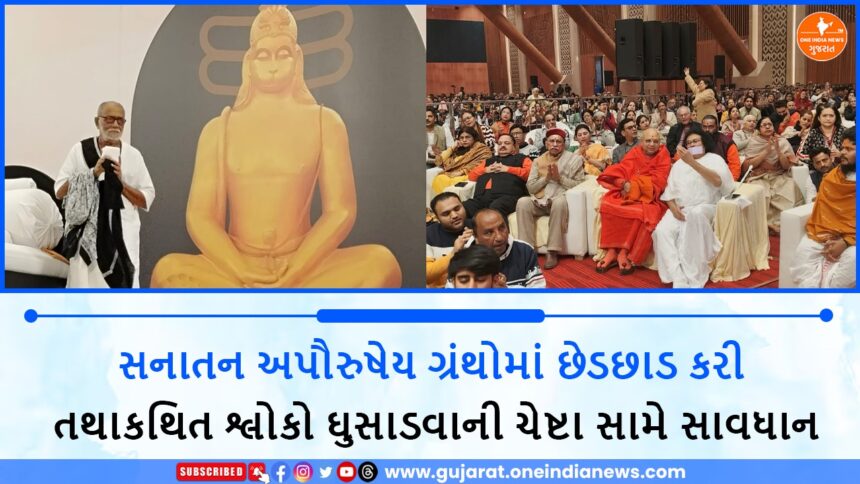 રાજધાની દિલ્હીમાં લોકેશ મુનિ સનાતનીના નેતૃત્વ સાથે રામકથા ‘માનસ સનાતન ધર્મ’ ગાન કરતાં મોરારિબાપુએ સનાતન અપૌરુષેય ગ્રંથોમાં છેડછાડ કરી તથાકથિત શ્લોકો ઘુસાડવાની ચેષ્ટા સામે સાવધાન રહેવા ભાર મૂક્યો.