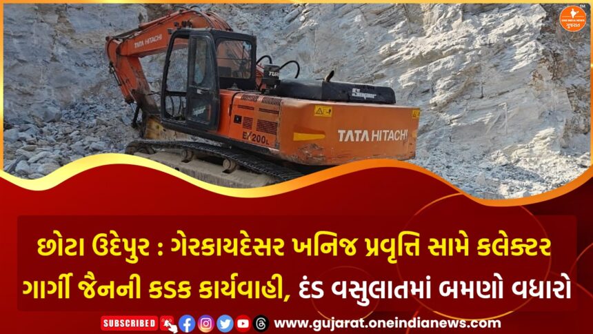 છોટા ઉદેપુર જિલ્લામાં ગેરકાયદેસર ખનન, વહન અને ખનીજના સંગ્રહ સામે જિલ્લા પ્રશાસને કડક વલણ અપનાવ્યું છે. કલેક્ટર ગાર્ગી જૈનની દિશાનિર્દેશ હેઠળ ભૂસ્તર વિજ્ઞાન અને ખનિજ વિભાગ દ્વારા અમલમાં મુકાયેલી ઝીરો ટોલરન્સ નીતિના પરિણામે કાર્યવાહી તેમજ દંડ વસુલાતમાં નોંધપાત્ર વધારો નોંધાયો છે. નવેમ્બર 2025 સુધીમાં જિલ્લામાં ગેરકાયદેસર ખનીજ પ્રવૃત્તિના કુલ 953 કેસ નોંધાયા છે, જ્યારે ગત વર્ષ નવેમ્બર 2024 સુધીમાં આ આંકડો 474 હતો. સાથે જ દંડ વસુલાતમાં પણ દોગણાથી વધુ વધારો થયો છે. વર્ષ 2024માં રૂ. 644.78 લાખની વસુલાત સામે 2025માં રૂ. 1290.44 લાખની નોંધપાત્ર વસુલાત કરવામાં આવી છે, જે પ્રશાસનની સક્રિયતા દર્શાવે છે.