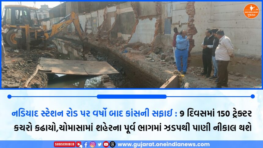 નડિયાદ શહેરના સ્ટેશન રોડ પર સરદાર પટેલની પ્રતિમા પાસે દુકાનો નીચે વર્ષોથી બંધ રહેલા કાંસની સફાઈની કામગીરી નડિયાદ મહાનગરપાલિકા દ્વારા હાથ ધરવામાં આવી છે. છેલ્લા 9 દિવસથી ચાલી રહેલી આ કામગીરીમાં અત્યાર સુધીમાં અંદાજે 150થી વધુ ટ્રેક્ટર જેટલો કચરો અને ગંદકી બહાર કાઢવામાં આવી છે. આ કાંસની સફાઈ થતાં આગામી ચોમાસામાં શહેરના પૂર્વ ભાગોમાં ભરાતા પાણીની સમસ્યામાં મોટી રાહત મળે તેવી શક્યતા છે.
