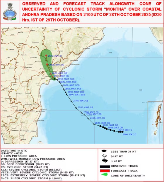 તે દરિયાકાંઠાના આંધ્રપ્રદેશમાં લગભગ ઉત્તરપશ્ચિમ તરફ આગળ વધવાની અને આગામી 6 કલાક દરમિયાન ચક્રવાતી તોફાનની તીવ્રતા જાળવી રાખવાની અને આગામી 6 કલાક દરમિયાન વધુ નબળું પડીને ડીપ ડિપ્રેશનમાં ફેરવાઈ જવાની શક્યતા છે. આ સાથે તેમણે એમ પણ જણાવ્યું કે, ચક્રવાતી તોફાન “મોન્થા” નું પાછળનું ક્ષેત્ર જમીનમાં પ્રવેશ્યું છે.