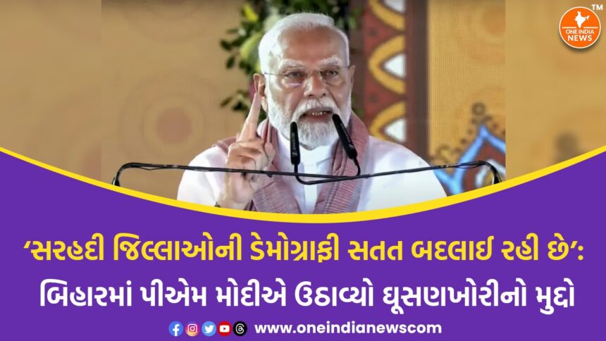 શુક્રવારે (22 ઑગસ્ટ) બિહારના પ્રવાસે આવેલા વડાપ્રધાન નરેન્દ્ર મોદીએ એક વિશાળ જનસભાને સંબોધિત કરતાં ઘૂસણખોરી અને ડેમોગ્રાફી પરિવર્તનના ગંભીર મુદ્દાને ખૂબ જ આક્રમક અંદાજમાં ઉઠાવ્યો હતો. પીએમ મોદીએ કહ્યું કે બિહારમાં, ખાસ કરીને સરહદી જિલ્લાઓમાં, ઘૂસણખોરોની સંખ્યા ઝડપથી વધી રહી છે અને તેના કારણે ડેમોગ્રાફીક માળખું બદલાઈ રહ્યું છે, જે રાજ્ય અને દેશ બંને માટે ચિંતાનો વિષય છે. લાલ કિલ્લા પરથી આપેલા પોતાના સંદેશનો ઉલ્લેખ કરતાં મોદીએ કહ્યું કે આ જોખમ માત્ર ઉત્તરપૂર્વ કે બંગાળ પૂરતું નથી, પણ બિહાર પણ તેની અસરથી અછૂતું નથી. તેમણે સ્પષ્ટ કર્યું કે NDA સરકાર ઘૂસણખોરોને કોઈ પણ પરિસ્થિતિમાં દેશનું ભવિષ્ય નક્કી કરવાની છૂટ નહીં આપે અને બિહારના યુવાઓના રોજગાર અને અધિકારો પર ઘૂસણખોરો હાથ નહીં મૂકી શકે. “જે અધિકારો ભારતીય નાગરિકોના છે, તેને આંચકી લઈને ઘૂસણખોરોને ક્યારેય નહીં આપી શકાય” એમ તેમણે ભારપૂર્વક જણાવ્યું.