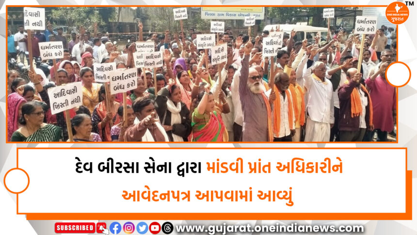 દેવ બિરસા સેના દ્વારા માંડવી તાલુકામાં ગેરકાયદેસર બનાવવામાં આવેલા ચર્ચો, ચર્ચો બનાવવા માટેનો ફંડ ક્યાંથી આવ્યું છે ? આ ચર્ચો કોણ બનાવી રહ્યું છે ? આ સમગ્ર બાબતની યોગ્ય તપાસ કરવા બાબતે માંડવી પ્રાંતને આવેદનપત્ર આપવામાં આવ્યું છે.