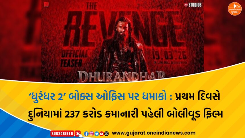 બોલીવૂડમાં નવા ઈતિહાસની રચના કરતા Dhurandhar: The Revenge (ધુરંધર 2) એ રિલીઝના પહેલા જ દિવસે બોક્સ ઓફિસ પર ધુરંધર પ્રદર્શન કર્યું છે. Ranveer Singh સ્ટારર આ ફિલ્મે વિશ્વભરમાં અંદાજે ₹236.63 કરોડથી ₹237 કરોડ સુધીની કમાણી કરીને અત્યાર સુધીની કોઈપણ હિન્દી ફિલ્મ માટે સૌથી મોટું ઓપનિંગ નોંધાવ્યું છે.