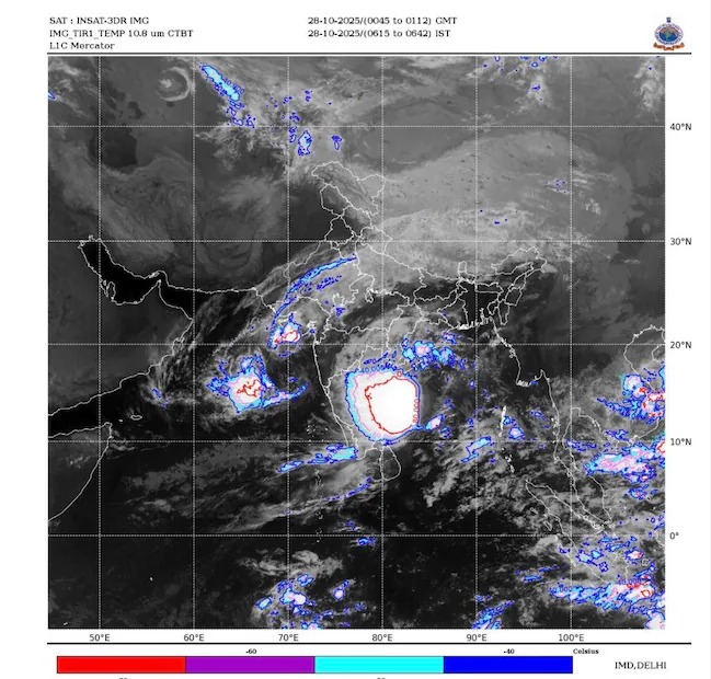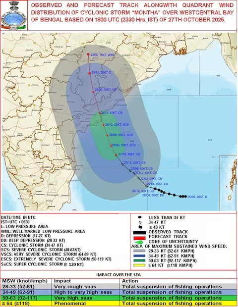હવામાન વિભાગ પાસેથી મળતી માહિતી પ્રમાણે, પશ્ચિમ મધ્ય અને દક્ષિણપશ્ચિમ બંગાળની ખાડીને અડીને આવેલા દક્ષિણપશ્ચિમ પર ચક્રવાતી તોફાન “મોન્થા” છેલ્લા 6 કલાક દરમિયાન 15 કિમી પ્રતિ કલાકની ઝડપે ઉત્તર-ઉત્તરપશ્ચિમ તરફ આગળ વધ્યું અને ગઈકાલે, 27 ઓક્ટોબર 2025 ના રોજ ભારતીય સમય મુજબ 2330 કલાકે, પશ્ચિમ મધ્ય બંગાળની ખાડી પર, 14.0° ઉત્તર અક્ષાંશ અને 83.5° પૂર્વ રેખાંશની નજીક, માછલીપટ્ટનમ (આંધ્ર પ્રદેશ) થી લગભગ 280 કિમી દક્ષિણ-દક્ષિણપૂર્વમાં, કાકીનાડા (આંધ્ર પ્રદેશ) થી 360 કિમી દક્ષિણ-દક્ષિણપૂર્વમાં, વિશાખાપટ્ટનમ (આંધ્ર પ્રદેશ) થી 410 કિમી દક્ષિણમાં, ગોપાલપુર (ઓડિશા) થી 610 કિમી દક્ષિણ-દક્ષિણપશ્ચિમમાં કેન્દ્રિત થયું.