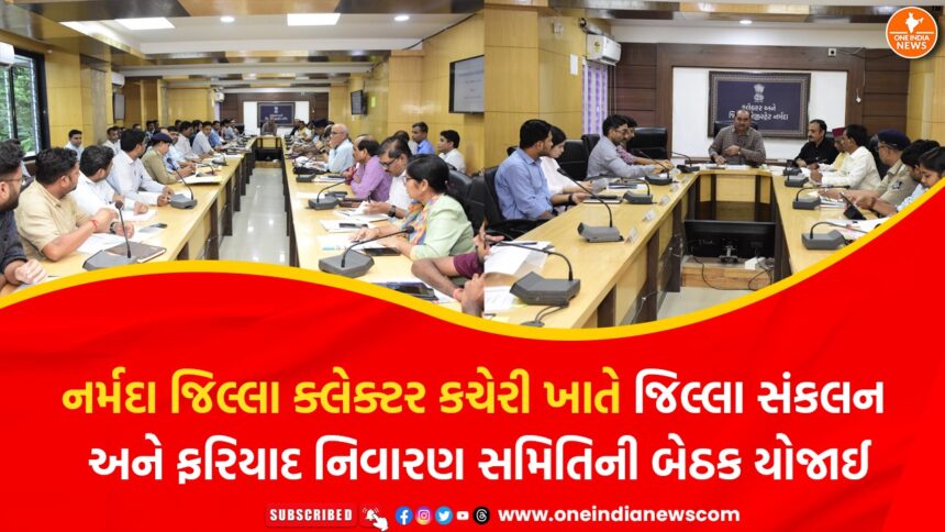 નર્મદા જિલ્લાના વિકાસ કાર્યોને વધુ ગતિશીલ બનાવવા અને પ્રજાના પ્રશ્નોના ઝડપી ઉકેલ માટે જિલ્લા વિકાસ અધિકારી આર. વી. વાળાની અધ્યક્ષતામાં કલેક્ટર કચેરીના કોન્ફરન્સ હોલમાં જિલ્લા સંકલન અને ફરિયાદ નિવારણ સમિતિની બેઠક યોજાઈ હતી. આ બેઠકમાં સાંસદ મનસુખભાઈ વસાવા તથા જિલ્લા પંચાયતના પ્રમુખ ભિમસિંહ તડવી ઉપસ્થિત રહ્યા હતા. તેમણે ગ્રામ્ય અને શહેરી વિસ્તારોમાંથી પ્રજાજનો દ્વારા રજૂ થતી સમસ્યાઓ તથા વિકાસલક્ષી જરૂરિયાતોને અધિકારીઓ સમક્ષ રજૂ કરી હતી.