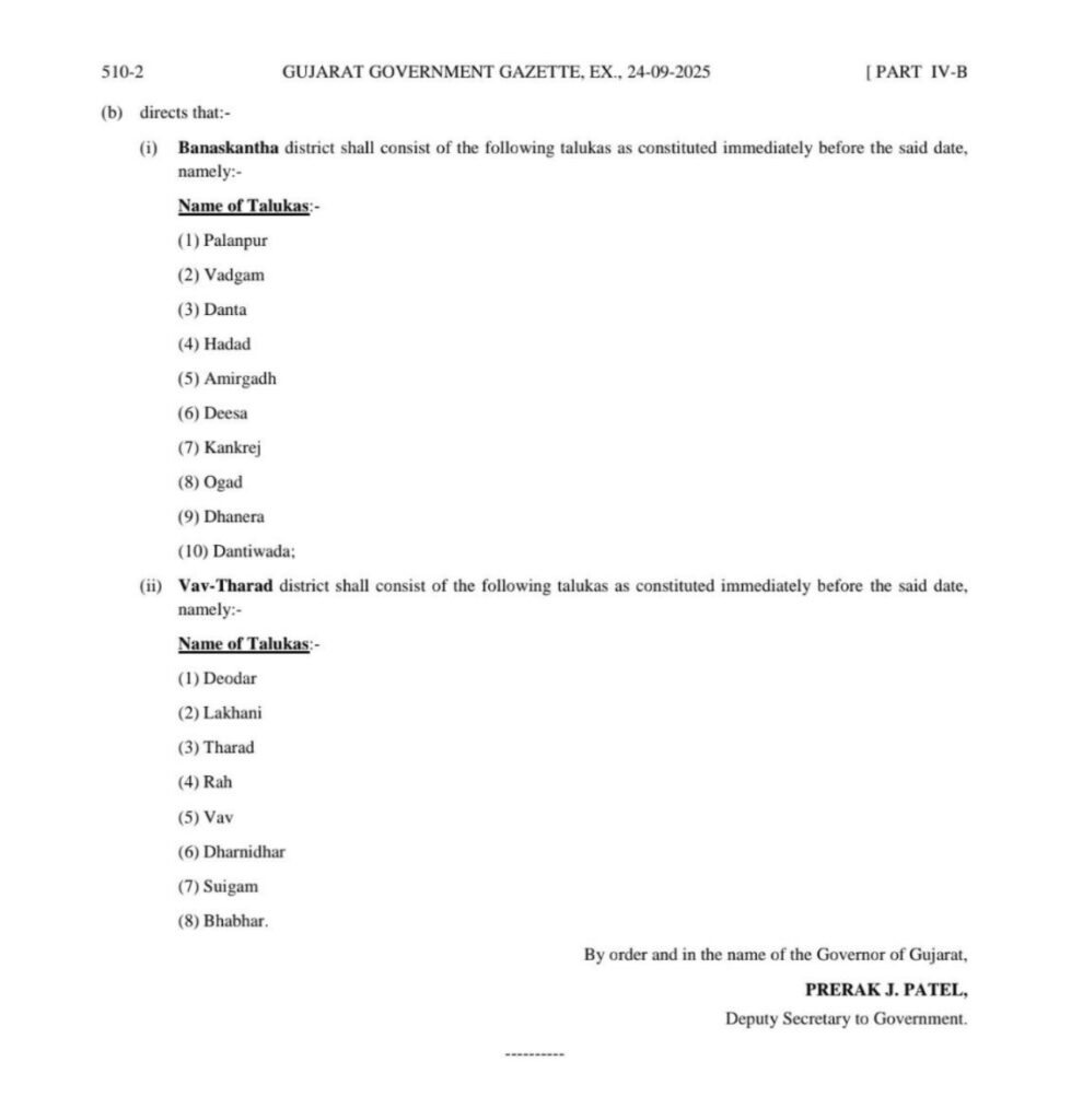 ગુજરાત સરકારે બનાસકાંઠા જિલ્લાના વહીવટી સુગમતા અને લોકસુવિધા માટે વર્ષોથી ચાલી રહેલી માંગણીઓને માન આપી તેનું સત્તાવાર વિભાજન જાહેર કર્યું છે. રાજ્ય સરકારે બહાર પાડેલા નોટિફિકેશન મુજબ, હાલનો બનાસકાંઠા જિલ્લો હવે બે જુદા જિલ્લાઓમાં વહેંચાશે—બનાસકાંઠા અને વાવ-થરાદ. આ મહત્વપૂર્ણ નિર્ણયનો મુખ્ય હેતુ નાગરિકોને સરકારી સેવાઓ વધુ સરળતાથી અને ઝડપી ગતિએ ઉપલબ્ધ કરાવવાનો છે, જેથી લોકો પોતાના કામકાજ માટે દૂર સુધી જવા મજબૂર ન થાય અને વહીવટી કાર્યો વધુ અસરકારક બને.