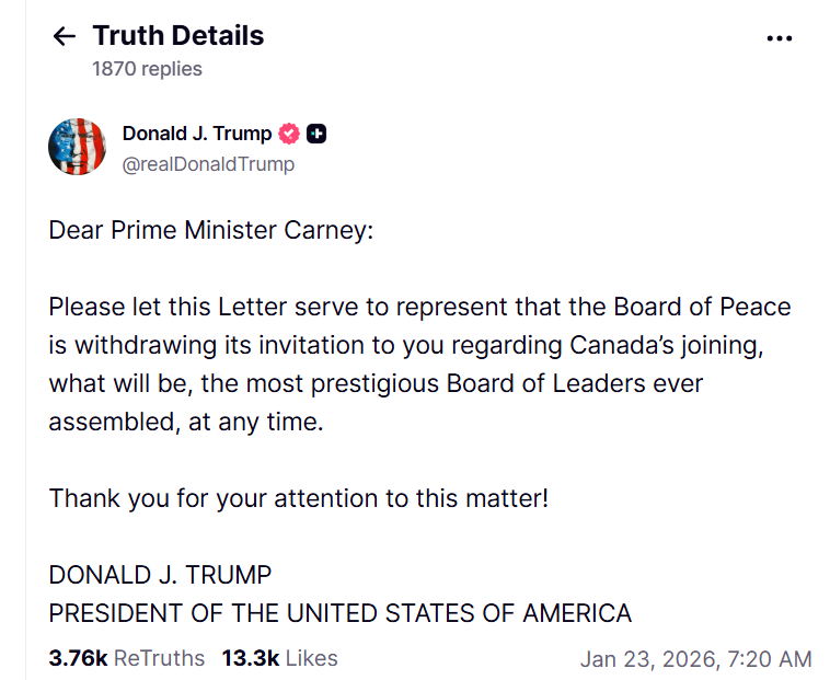 ટ્રમ્પે પોતાની સોશિયલ મીડિયા પ્લેટફોર્મ ‘ટ્રુથ સોશિયલ’ પર પોસ્ટ કરીને લખ્યું હતું કે, “પ્રિય પ્રધાનમંત્રી કાર્ની, આ પત્ર દ્વારા તમને જાણ કરવામાં આવે છે કે ‘બોર્ડ ઑફ પીસ’ તમને અત્યાર સુધીના સૌથી પ્રતિષ્ઠિત ગણાતા ‘બોર્ડ ઑફ લીડર્સ’માં જોડાવા માટે આપેલું આમંત્રણ હવે પાછું ખેંચી લેવામાં આવે છે.” કાર્નીએ પોતાના ભાષણમાં કહ્યું હતું કે દુનિયા હવે ‘રૂલ્સ-બેઝ્ડ ઓર્ડર’માંથી બહાર આવીને વિભાજન અથવા ‘રપ્ચર’ના તબક્કામાં પ્રવેશી રહી છે, જ્યાં મોટી શક્તિઓ આર્થિક એકીકરણ, વેપાર અને ટેરિફને ભૂ-રાજકીય હથિયાર તરીકે વાપરી રહી છે. તેમણે ઉમેર્યું હતું કે આવી પરિસ્થિતિમાં કેનેડા જેવી મધ્યમ શક્તિઓએ પોતાનું સ્વતંત્ર રક્ષણ અને હિતો પર ભાર મૂકવો જરૂરી છે.
