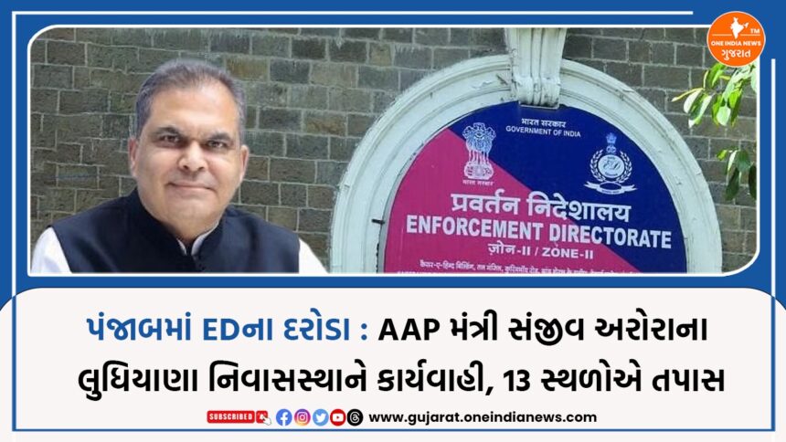 One India News > News > Gujarat > પંજાબમાં EDના દરોડા : AAP મંત્રી સંજીવ અરોરાના લુધિયાણા નિવાસસ્થાને કાર્યવાહી, 13 સ્થળોએ તપાસ