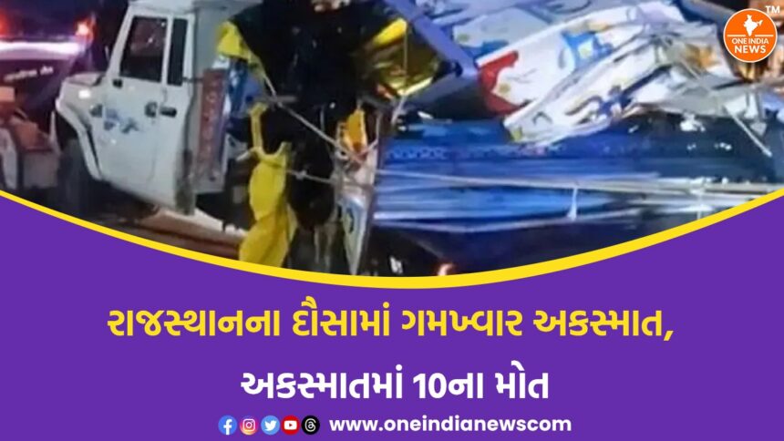 રાજસ્થાનના દૌસા જિલ્લામાં બાપી નજીક મંગળવારે એક ભયાનક માર્ગ અકસ્માતમાં ખાટુશ્યામ મંદિરના દર્શન કરીને પરત ફરી રહેલા શ્રદ્ધાળુઓને લઈ જતી પિકઅપ વાનની એક ટ્રેલર ટ્રક સાથે જોરદાર ટક્કર થતા 10 લોકોના મોત થયા છે, જેમાં 7 બાળકો અને 3 મહિલાઓનો સમાવેશ થાય છે. પોલીસે આપેલી પ્રાથમિક માહિતી મુજબ, અકસ્માત એટલો ગંભીર હતો કે વાહનનું આગળનું ભાગ સંપૂર્ણ રીતે ક્ષતિગ્રસ્ત થઈ ગયું અને મુસાફરોને બહાર કાઢવા માટે ભારે મહેનત કરવી પડી.