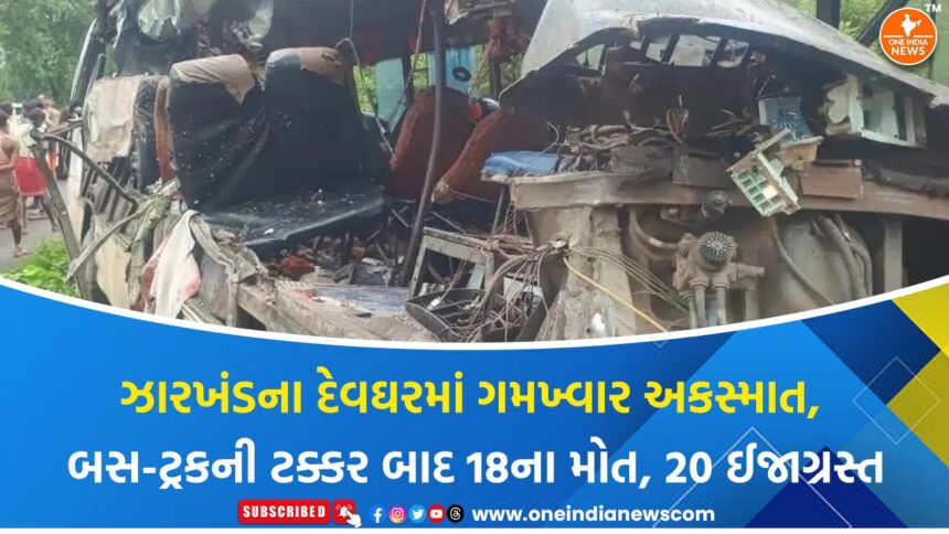 ઝારખંડના પવિત્ર ધાર્મિક સ્થળ દેવઘરમાં મંગળવારે વહેલી સવારે એક ભયાનક માર્ગ અકસ્માતમાં 18 કાવડિયાઓએ પોતાનો જીવ ગુમાવ્યો છે. આ દુર્ઘટનામાં વધુમાં વધુ લોકો ગંભીર રીતે ઘાયલ થયા છે અને તેમને તાત્કાલિક સારવાર માટે નજીકની હોસ્પિટલમાં ખસેડવામાં આવ્યા છે. મળતી માહિતી અનુસાર, તમામ કાવડિયાઓ બાબા બૈજનાથ ધામ, દેવઘરમાં જલાભિષેક કરી દુમકા જિલ્લામાં આવેલા પ્રસિદ્ધ બાસુકીનાથ મંદિરે જલાર્પણ માટે જઈ રહ્યા હતા. મુસાફરી દરમિયાન મોહનપુર પોલીસ સ્ટેશનના જમુનિયા વિસ્તારમાં તેમની બસની ટક્કર એક LPG સિલિન્ડર ભરેલા ટ્રક સાથે થઇ હતી. ટક્કર એટલી જોરદાર હતી કે પાંચ શ્રદ્ધાળુઓનું મોત ઘટનાસ્થળે જ થયું હતું, જ્યારે બાકીની મૃત્યુદંડ ઘટનાના થોડા સમય પછી સારવાર દરમ્યાન થયો હોવાની શક્યતા છે.