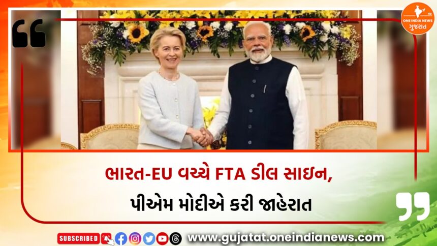 પ્રધાનમંત્રી નરેન્દ્ર મોદીએ ભારત અને યુરોપિયન યુનિયન (EU) વચ્ચેના ફ્રી ટ્રેડ એગ્રીમેન્ટ (FTA) પર હસ્તાક્ષર થઈ ગયા હોવાની અધિકારીક પુષ્ટિ આપી છે. તેમણે જણાવ્યું છે કે આ કરાર પર 26 જાન્યુઆરીના રોજ હસ્તાક્ષર કરવામાં આવ્યા હતા અને આને “મધર ઑફ ઑલ ડીલ્સ” તરીકે વર્ણવ્યું છે. આ કરારને વિશ્વની સૌથી મોટી અને મહત્વપૂર્ણ વેપાર સમજૂતીઓમાંની એક માનવામાં આવી રહી છે, જે ભારત અને યુરોપિયન યુનિયન વચ્ચેના આર્થિક, વ્યૂહાત્મક અને વેપારી સંબંધોને નવા સ્તરે લઇ જશે.