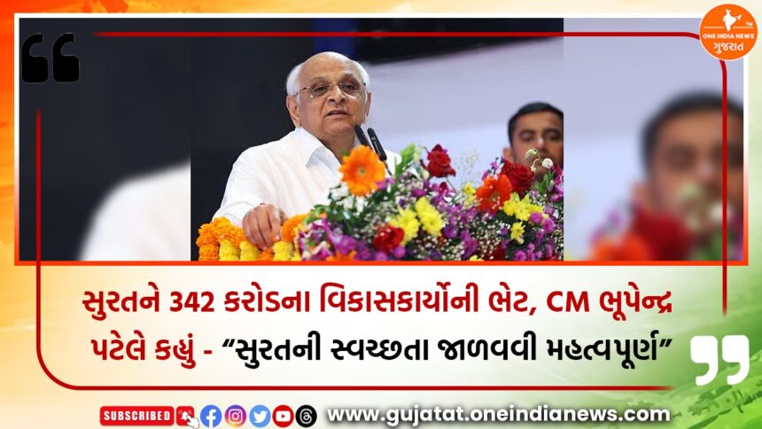 One India News > News > Gujarat > સુરતને 342 કરોડના વિકાસકાર્યોની ભેટ, CM ભૂપેન્દ્ર પટેલે કહ્યું – “સુરતની સ્વચ્છતા જાળવવી મહત્વપૂર્ણ”