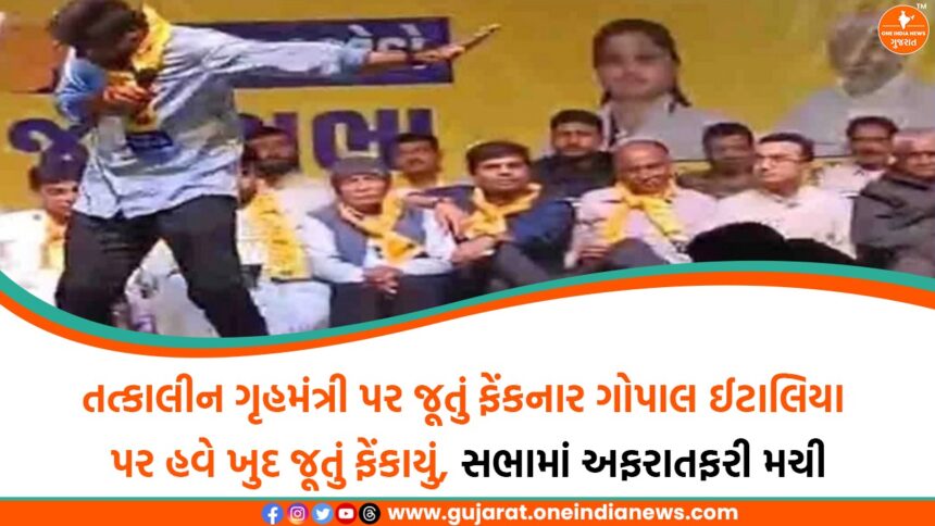 જામનગરમાં આમ આદમી પાર્ટીની એક જાહેર સભા દરમિયાન થયેલી ઘટનાએ રાજકીય માહોલમાં ચકચાર મચાવી છે, જ્યાં પાર્ટીના ધારાસભ્ય ગોપાલ ઈટાલિયા પર સભા વચ્ચે જ એક અજાણ્યા વ્યક્તિએ જૂતું ફેંક્યું હતું. ગોપાલ ઈટાલિયા સ્ટેજ પર ઉભા રહીને ભાષણ કરી રહ્યા હતા ત્યારે અચાનક એક વ્યક્તિ સ્ટેજની નજીક આવ્યો અને પોતાનું જૂતું કાઢીને સીધું ગોપાલ તરફ ફેંકી દીધું.