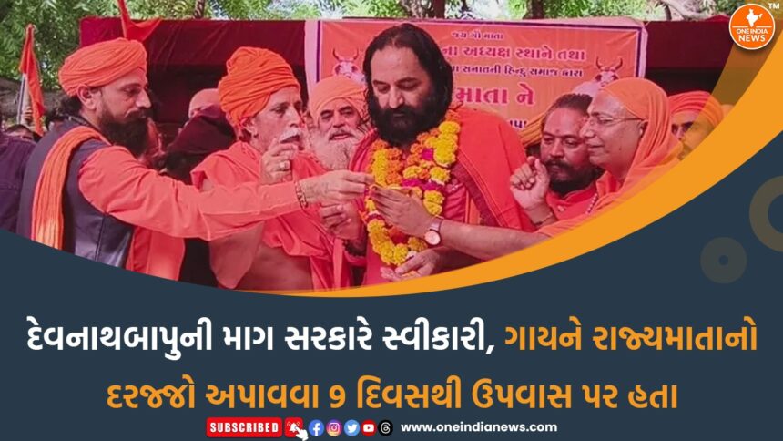 છેલ્લા નવ દિવસથી કચ્છના ભુજ ખાતે કલેક્ટર કચેરી બહાર યોગી દેવનાથબાપુ ગાયને રાજ્યમાતા જાહેર કરવાની માગ સાથે અનશન ઉપવાસ પર બેઠા હતા. ગૌમાતાને રાજ્યના સન્માન અને સંસ્કૃતિનું પ્રતિક માનવામાં આવે છે અને તે જ ભાવનાને ધ્યાને રાખીને આ માંગણી સતત બુલંદ કરવામાં આવી રહી હતી. આજે આ અનશનનો નવમો દિવસ હતો, ત્યારે સરકાર તરફથી સકારાત્મક સંકેત મળ્યા. ગુજરાતના મુખ્યમંત્રી ભુપેન્દ્ર પટેલે કચ્છના પાંચ પ્રતિષ્ઠિત સંતોને ગાંધીનગર તેમના નિવાસસ્થાને બોલાવીને ખાસ બેઠક યોજી હતી. આ બેઠકમાં તેમણે સંતોને ખાતરી આપી કે ગાયને રાજ્યમાતાનો દરજ્જો આપવા સરકાર ટૂંક સમયમાં કાયદાકીય પગલાં લેશે.