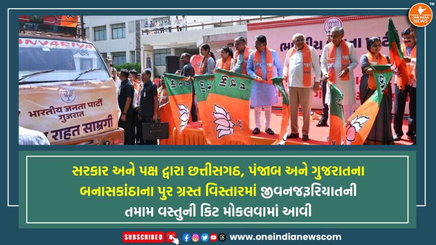 ભારતીય જનતા પાર્ટી ગુજરાત પ્રદેશ મીડિયા વિભાગ એક અખબારી યાદીમાં જણાવે છે કે, ભારતીય જનતા પાર્ટી અને રાજય સરકારના સંયુકત ઉપક્રમે આજે પુરગ્રસ્ત વિસ્તાર જેવા કે છત્તિસગઢ, પંજાબ અને ગુજરાતના બનાસકાંઠામા રાહત સામગ્રી પહોંચડાવામાં આવી રહી છે. આજ રોજ રાજયના મુખ્યમંત્રી ભુપેન્દ્રભાઇ પટેલ તેમજ રાજયનામંત્રીઓ રૂષીકેશભાઇ પટેલ, કુંવરજીભાઇ બાવળીયા, મહામંત્રી રજનીભાઇ પટેલ, ધારાભ્યઓ રીટાબેન પટેલ, પાયલબેન કુકરાણી, ગાંઘીનગર શહેર પ્રમુખ આશિષભાઇ દવે સહિતના આગેવાનોએ રાહત સામગ્રીના જથ્થા સાથેના ટ્રકોનું પ્રસ્થાન પ્રદેશ કાર્યાલય કમલમ ખાતે કરાવ્યું હતું. પંજાબમા રેલ્વેના માધ્યમથી રાહત સામગ્રી મોકલવામાં આવનાર છે મુખ્યમંત્રી ભુપેન્દ્રભાઇ પટેલે ટ્રેનને લીલીઝંડી આપી પ્રસ્થાન કરાવ્યું હતું.