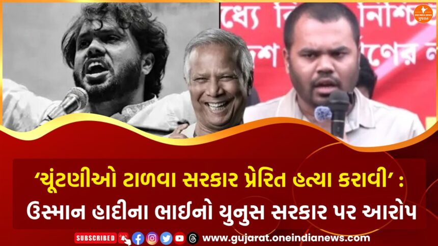 બાંગ્લાદેશમાં જુલાઈ 2024ના કથિત વિદ્યાર્થી આંદોલનના મુખ્ય સૂત્રધાર અને કટ્ટરપંથી નેતા શરીફ ઉસ્માન હાદીના મોત બાદ દેશભરમાં અસ્થિરતા અને હિંસા વધી ગઈ છે. હવે આ મામલે ઉસ્માન હાદીના ભાઈએ મોહમ્મદ યુનુસની વચગાળાની સરકાર પર અત્યંત ગંભીર આરોપો લગાવ્યા છે. તેણે સીધો આરોપ કરતા કહ્યું કે ઉસ્માન હાદીની હત્યા કોઈ અજાણ્યા હુમલાખોરોએ નહીં, પરંતુ યુનુસ સરકારના જ એક જૂથે કરાવી છે. તેનો દાવો છે કે સરકાર આ હત્યાનો ઉપયોગ આગામી સામાન્ય ચૂંટણીઓને ખોરવવા અથવા પાછળ ઠેલવા માટે કરી રહી છે.