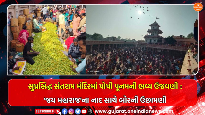 નડિયાદ સ્થિત સુપ્રસિદ્ધ સંતરામ મંદિરમાં આજે શનિવારે પોષી પૂનમના પાવન પર્વ નિમિત્તે ભક્તિ અને શ્રદ્ધાનો ત્રિવેણી સંગમ રચાયો હતો. રાજ્યભરમાંથી ઉમટી પડેલા હજારો શ્રદ્ધાળુઓએ મંદિરના ચોકમાં ‘જય મહારાજ’ના ગગનભેદી નાદ સાથે બોરની ઉછામણી કરીને ધન્યતા અનુભવી હતી.