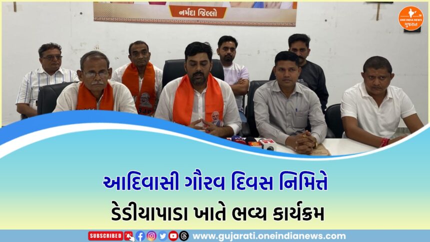 આદિવાસી ગૌરવ દિવસ નિમિત્તે તા. ૨૬ના રોજ ડેડીયાપાડા તાલુકાના ખોખરા ઉમર ખાતે ભવ્ય કાર્યક્રમનું આયોજન કરવામાં આવ્યું છે. આ અંગે નર્મદા જિલ્લા ભાજપના જિલ્લા પ્રમુખ શ્રી નીલ રાવે શ્રી કમલમ્, નર્મદા, રાજપીપલા ખાતે માહિતી આપતા જણાવ્યું હતું કે કાર્યક્રમમાં પ્રદેશ આદિજાતિ મોરચાના પ્રમુખ ગણપતભાઈ વસાવાનું વિશેષ અભિવાદન કરવામાં આવશે.કાર્યક્રમમાં ગુજરાત રાજ્યના નાયબ મુખ્યમંત્રી હર્ષ સંઘવી ખાસ ઉપસ્થિત રહી કાર્યક્રમને ગૌરવવંત બનાવશે.