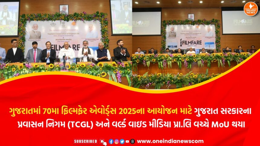 70મા ફિલ્મફેર એવોર્ડસના આયોજન માટે ટુરીઝમ કોર્પોરેશન ઓફ ગુજરાત લિમિટેડ અને વર્લ્ડ વાઈડ મિડીયા પ્રા. લિમિટેડ વચ્ચે ગાંધીનગરમાં યોજાયેલા ગૌરવશાળી સમારોહમાં મુખ્યમંત્રી ભૂપેન્દ્ર પટેલની પ્રેરક ઉપસ્થિતિમાં MOU કરવામાં આવ્યા હતા.