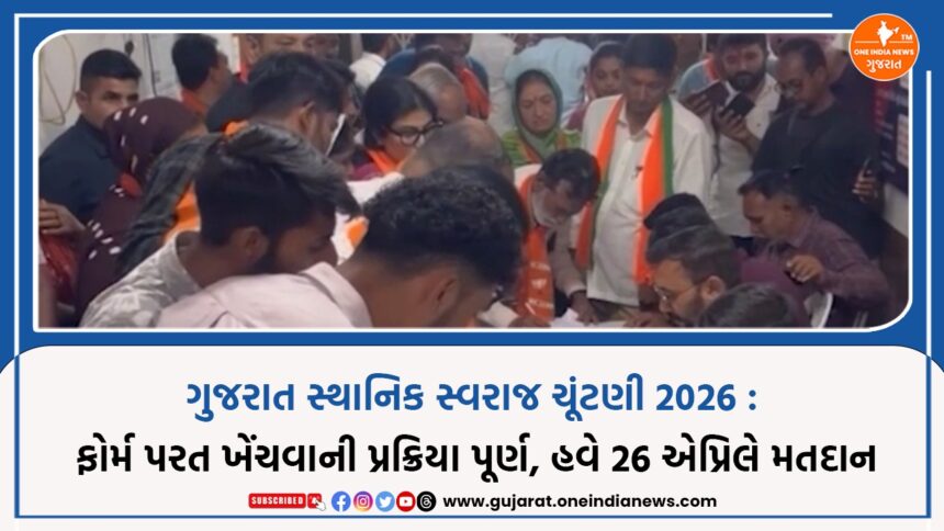 ગુજરાતમાં સ્થાનિક સ્વરાજની ચૂંટણીને લઈને રાજકીય ગરમાવો હવે ચરમસીમાએ પહોંચ્યો છે. 26 એપ્રિલે યોજાનારા મતદાન પૂર્વે 15 એપ્રિલના રોજ ઉમેદવારી ફોર્મ પરત ખેંચવાની અંતિમ તારીખ પૂર્ણ થતાં હવે ચૂંટણીનું ચિત્ર સ્પષ્ટ બન્યું છે. રાજ્યભરમાં મોટી સંખ્યામાં ઉમેદવારોએ પોતાના નામ પાછા ખેંચતા હવે મુખ્ય રાજકીય પક્ષો વચ્ચે સીધી ટક્કર જોવા મળશે.