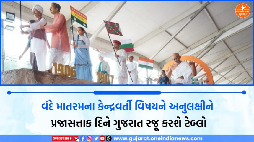 ‘વંદે માતરમ’ ગીતની 150મી વર્ષગાંઠના ઉપલક્ષમાં તેની ગુંજ અને ભાવના પ્રતિબિંબિત કરતી ભારતીય રાષ્ટ્રધ્વજની નિર્માણયાત્રા, બદલાતી તાસીર અને ઐતિહાસિક વિકાસની રોચક રજૂઆત 77મા પ્રજાસત્તાક પર્વે રજૂ થનારા ગુજરાતના ટેબ્લોની મુખ્ય વિશેષતા બની છે. આ ટેબ્લો ‘વંદે માતરમ’ શબ્દની પૃષ્ઠભૂમિથી શરૂ થઈને સ્વતંત્ર ભારતના ત્રિરંગા સુધીની યાત્રાને કલાત્મક અને વિચારપ્રેરક રીતે રજૂ કરે છે. સાથે સાથે, ગુજરાતની ધરતી પર જન્મેલા ક્રાંતિવીર શ્યામજી કૃષ્ણવર્મા, સરદારસિંહ રાણા અને વિદેશની ભૂમિ પરથી ભારતીય સ્વતંત્રતાની જ્યોત પ્રગટાવનાર વીરાંગના મેડમ ભિખાઈજી કામાની યશોગાથા પણ આ ટેબ્લોમાં જીવંત બને છે. મેડમ કામાએ તૈયાર કરેલા ‘વંદે માતરમ’ લિખિત ધ્વજની કથા, મહાત્મા ગાંધીના ‘ચરખા’ દ્વારા સ્વદેશી અને આત્મનિર્ભરતાના સંદેશ સાથે જોડાઈને આજના ‘આત્મનિર્ભર ભારત’ અભિયાન સાથે સુંદર સંકલન રચે છે.