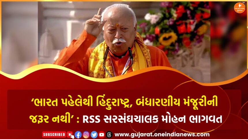 રાષ્ટ્રીય સ્વયંસેવક સંઘ (RSS)ના સરસંઘચાલક મોહન ભાગવતે રવિવારે (21 ડિસેમ્બર) કોલકાતામાં યોજાયેલા એક સંમેલનમાં હિંદુરાષ્ટ્રના મુદ્દે સ્પષ્ટ અને તીવ્ર નિવેદન આપ્યું છે. તેમણે કહ્યું કે ભારત પહેલેથી જ હિંદુરાષ્ટ્ર છે અને તેને હિંદુરાષ્ટ્ર જાહેર કરવા માટે ભારતીય બંધારણની મંજૂરી લેવાની કોઈ જરૂર નથી. ભાગવતે હિંદુરાષ્ટ્રને સ્વયંસિદ્ધ વાસ્તવિકતા ગણાવતા કહ્યું કે જેમ સૂર્ય પૂર્વમાં ઊગે છે એ માટે કોઈ બંધારણીય મંજૂરી લેવાતી નથી, એ જ રીતે હિન્દુસ્તાન હિંદુરાષ્ટ્ર છે એ પણ સ્વયંસિદ્ધ સત્ય છે. તેમના શબ્દોમાં, જે કોઈ ભારતને પોતાની માતૃભૂમિ માને છે, ભારતીય સંસ્કૃતિનો આદર કરે છે, અહીંની ધરતી પર વસતા તમામ લોકો અને ભારતીય પૂર્વજોની મહિમામાં વિશ્વાસ રાખે છે, ત્યાં સુધી ભારત હિંદુરાષ્ટ્ર છે.