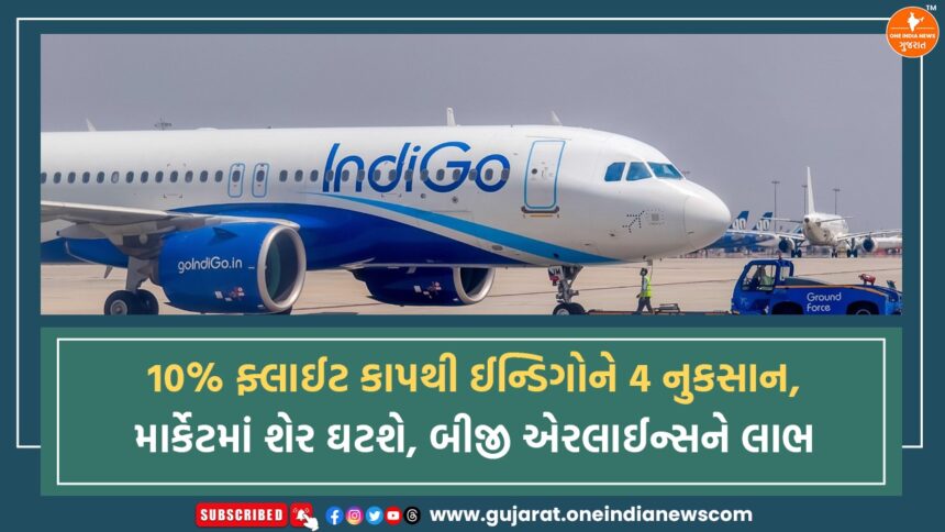 સરકારના આ કડક નિર્ણયથી ઈન્ડિગોને ચાર મોટા ઝટકા લાગશે. સૌથી પહેલા, દરરોજ 220 ફ્લાઇટ્સ પર સીધી અસર પડશે, જેનું પરિણામ છે કે દરરોજ લગભગ 2,200 ફ્લાઇટ્સ કાપા લાગશે. બીજું, તેના કારણે ઈન્ડિગોના માર્કેટ શેર પર અસર થશે. ભારતીય એવિએશન માર્કેટમાં 65% ભાગીદારી ધરાવતી ઈન્ડિગો માટે આ કાપ અને ફ્લાઇટ્સની રી-ડિસ્ટ્રિબ્યૂટ પ્રક્રિયા તેના માર્કેટ શેરને 55-57% સુધી ઘટાડવાની શક્યતા ધરાવે છે. ત્રીજું, આ પગલાં ઈન્ડિગોની કમાણી પર સીધી અસર કરશે, કારણ કે દરરોજ 220 ફ્લાઇટ્સમાં ઘટાડો અને અન્ય એરલાઈન્સને ફાળવણી એ તેના રેવન્યુને ઓછું કરશે. ચોથું, આ કારણે પેરેન્ટ કંપની ઈન્ટરગ્લોબ એવિએશન લિમિટેડના શેરમાં ઘટાડો જોવા મળી રહ્યો છે; છેલ્લા પાંચ ટ્રેડિંગ દિવસોમાં શેર 12%થી વધુ ઘટી ગયો છે અને માર્કેટ કેપ 1.89 લાખ કરોડ પર આવી ગયું છે.