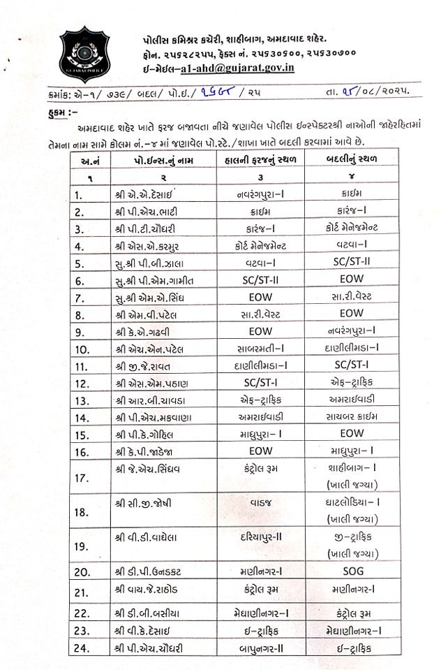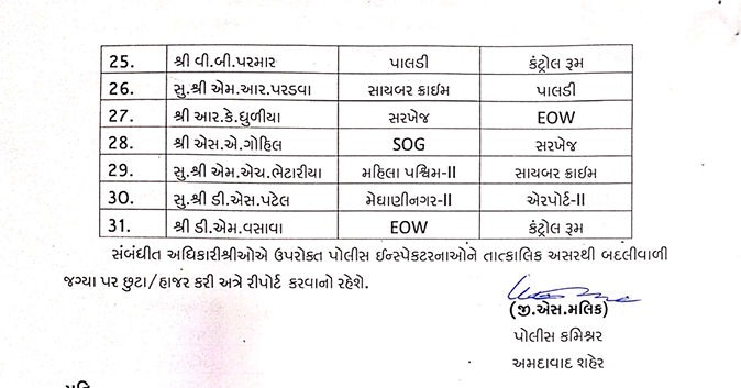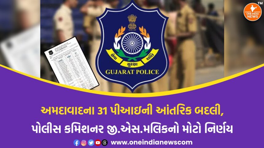 અમદાવાદ શહેરમાં કાયદો અને વ્યવસ્થાને વધુ સક્ષમ બનાવવા માટે પોલીસ કમિશનર જી.એસ. મલિકે એક મહત્વપૂર્ણ પગલું ભર્યું છે. શહેરના પોલીસ તંત્રમાં કાર્યક્ષમતાને વધારવા અને કાનૂની વ્યવસ્થામાં મજબૂતાઈ લાવવા માટે 31 પોલીસ ઇન્સ્પેક્ટર (પીઆઇ)ની આંતરિક બદલીના આદેશ જાહેર કરવામાં આવ્યા છે. આ આંતરિક બદલી અંતર્ગત શહેરના વિવિધ પોલીસ સ્ટેશનોમાં નવા પીઆઇની નિમણૂક કરવામાં આવી છે, જેથી કાયદો અને વ્યવસ્થા જાળવવામાં કોઈપણ પ્રકારની ખામી ન રહે. ખાસ કરીને, છેલ્લા કેટલાક સમયથી શાહીબાગ અને ઘાટલોડિયા પોલીસ સ્ટેશનોમાં પીઆઇની જગ્યાઓ ખાલી હતી, ત્યાં પણ નવી નિમણૂક કરીને આ ખાલી જગ્યા પૂરી કરવામાં આવી છે, જે સ્થાનિક લોકોને રાહતરૂપ થશે.