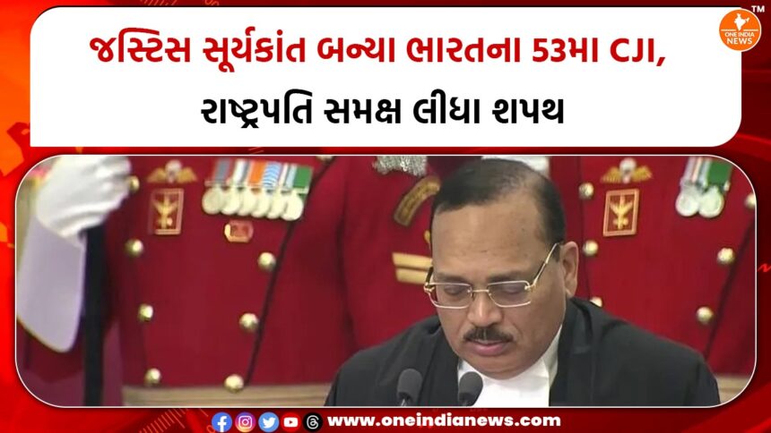 જસ્ટિસ સૂર્યકાંતે સોમવારે, 24 નવેમ્બર 2025ના રોજ ભારતના 53મા મુખ્ય ન્યાયાધીશ તરીકે શપથ લીધા અને સત્તાવાર રીતે કાર્યભાર સંભાળ્યો. રાષ્ટ્રપતિ દ્રૌપદી મુર્મુએ રાષ્ટ્રપતિ ભવનમાં યોજાયેલા ગૌરવસભર સમારંભમાં તેમને શપથ લેવડાવી। જસ્ટિસ સૂર્યકાંતે પૂર્વ મુખ્ય ન્યાયાધીશ બીઆર ગવઈનું સ્થાન લીધું છે, જેમણે રવિવારે નિવૃત્તિ લીધી હતી. બંધારણની કલમ 124(2) હેઠળ નિયુક્ત થયેલા સૂર્યકાંતેની ભલામણ પણ પૂર્વ CJI ગવઈએ જ કરી હતી.