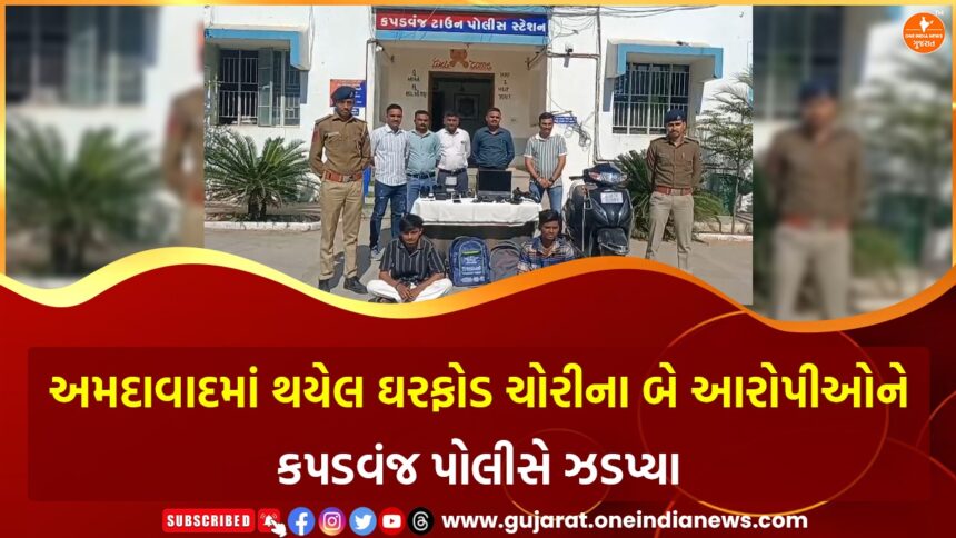 જીલ્લામાં મિલ્કત વિરૂધ્ધના ગુનાઓ બનતા અટકાવવા અસરકારક અને પરીણામલક્ષી કામગીરી કરવા અન્વયે કપડવંજ ટાઉન પોલીસ ઈન્સ્પેક્ટર જનકસિંહ દેવડા કપડવંજ ટાઉન પોલીસ સ્ટેશન સર્વેલન્સ સ્કવોડૅના પોલીસ માણસો સાથે પ્રયત્નશીલ હતા. તે દરમિયાન સર્વેલન્સ સ્કવોડૅના પો.કો.પ્રવિણસિંહ રમેશભાઈ બ.નં.૫૦૧ તથા પો.કો.પ્રિયંકકુમાર અશ્વિનભાઈ બ.નં.૪૪૦ નાઓને અંગત બાતમીદારથી સંયુક્ત બાતમી મળેલ કે, અમદાવાદ શહેર એલીસબ્રીજ પોલીસ સ્ટેશન પાર્ટ એ. ગુ.ર.નંબર-૧૧૯૦૧૦૧૪૨૫૦૨૦૫ /૨૦૨૫ ભારતીય ન્યાય સંહીતાની કલમ -૩૦૫, ૩૩૧(૪) મુજબના ઘરફોડ ચોરીના ગુનામાં ચોરાયેલ અસલ મુદ્દામાલ જેમાં કેમેરા, લેપટોપ, કેમેરાના લેન્સ, બેટરી ગિંબલ સ્ટેન્ડ વિગેરે સાથે બે ઇસમો એક્ટીવા નંબર GJ 07 FD 2081 ઉપર લઈને કપડવંજ શહેરમાં વેચાણ કરવા આવનાર છે જે બાતમી હકીકત આધારે કપડવંજ દાણા ચોકડી ખાતે વોચ તપાસમાં રહી બાતમી હકીકતના વર્ણન મુજબનું વાહન એક્ટીવા આવતા તેમાં સવાર બંને ઇસમો તપાસતા ઉપરોક્ત ગુનામાં ચોરાયેલ રૂ.૭,૪૫,૩૦૦/-નો મુદ્દામાલ મળી આવતા બંને આરોપીઓને BNSS કલમ ૩૫(૧)(ઈ) મુજબ પકડી અટક કરી મુદ્દામાલ BNSS કલમ ૧૦૬ મુજબ કબ્જે કરી એલીસબ્રિજ પોલીસ સ્ટેશન અમદાવાદ શહેર ખાતે સોંપવા જાણ કરવામાં આવી હતી.