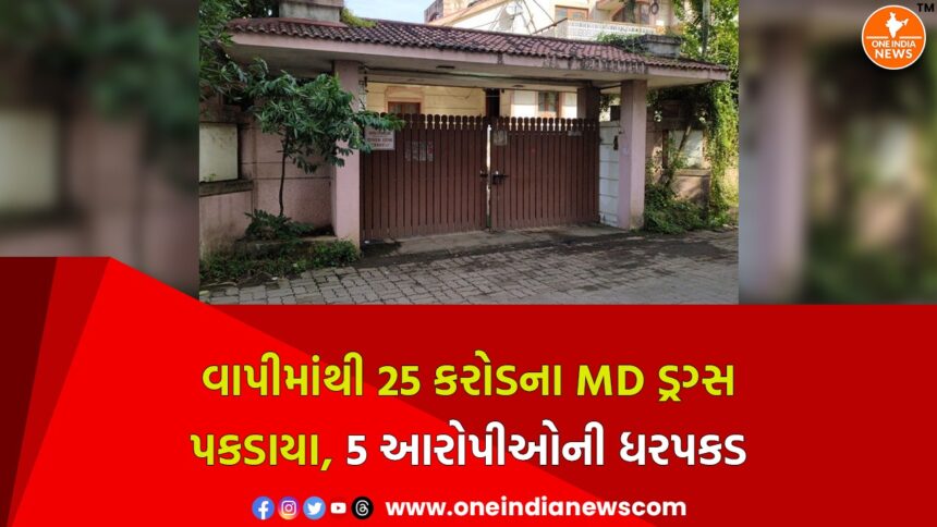 રાજ્યમાં ડ્રગ્સનો વેપાર દિવસેને દિવસે વધી રહ્યો છે અને પોલીસ-એજન્સીઓ માટે મોટું માથાનું દુખાવું બની ગયો છે. તાજેતરમાં વાપીના ચલા વિસ્તારમાં આવેલા એક બંગલામાં એટીએસ (ATS) અને એસઓજી (SOG)ની સંયુક્ત ટીમે દરોડો પાડ્યો હતો. આ દરોડામાં એમડી (MD) ડ્રગ્સનું કારખાનું ઝડપાયું છે. પોલીસે સ્થળ પરથી પાંચ કિલોથી વધુ માત્રામાં એમડી ડ્રગ્સ જપ્ત કર્યા છે, જેની આંતરરાષ્ટ્રીય બજાર કિંમત અંદાજે 25 કરોડ રૂપિયા થાય છે. આ કેસમાં પેરોલ જમ્પ કરેલો આરોપી, તેનો પુત્ર અને તેમના સાથીદારો સહિત પાંચ આરોપીઓને પોલીસે પકડી પાડ્યા છે.