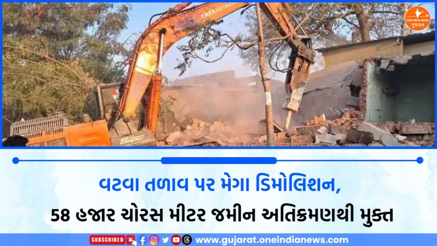 અમદાવાદ મ્યુનિસિપલ કોર્પોરેશન (AMC) દ્વારા વટવા વિસ્તારમાં આવેલા વાંદરવટ તળાવ (વટવા તળાવ) પર થયેલા ગેરકાયદેસર અતિક્રમણોને દૂર કરવા માટે વહેલી સવારથી મેગા ડિમોલિશન કાર્યવાહી હાથ ધરવામાં આવી, જેમાં શહેરના જળાશયોના સંરક્ષણ અને પુનઃસ્થાપન તરફ એક મહત્વપૂર્ણ પગલું ભરાયું છે. આ ઑપરેશન હેઠળ અંદાજે 400થી 430 ગેરકાયદેસર કાચા-પાકા રહેણાંક મકાનો અને લગભગ 30 કોમર્શિયલ દબાણો દૂર કરવામાં આવ્યા, જેના પરિણામે આશરે 58,000 ચોરસ મીટર જેટલી કિંમતી સરકારી જમીન મુક્ત થશે. AMCનું આયોજન છે કે તળાવની આસપાસ ફેન્સિંગ કરીને તેની સુરક્ષા સુનિશ્ચિત કરવામાં આવશે તેમજ ભવિષ્યના વિકાસ માટે 18 મીટર અને 24 મીટર પહોળાઈના રસ્તાઓ બનાવવામાં આવશે, જેથી વિસ્તારની ટ્રાફિક વ્યવસ્થા અને શહેરી માળખું સુધરી શકે.