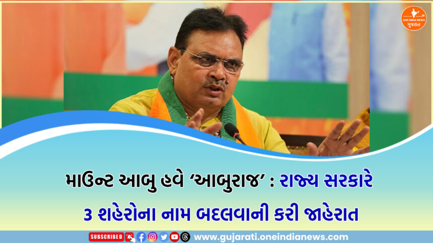 રાજ્યના પ્રખ્યાત હિલ સ્ટેશન માઉન્ટ આબુનું નામ હવે “આબુરાજ” રાખવાનો નિર્ણય લેવામાં આવ્યો છે. સાથે જ કામાનું નામ “કામવન” અને જહાજપુરનું નામ “યજ્ઞપુર” રાખવામાં આવશે. મુખ્યમંત્રી ભજન લાલ શર્માએ જણાવ્યું હતું કે આ નામોમાં ફેરફાર કરીને આ વિસ્તારોની પ્રાચીન અને ધાર્મિક ઓળખને ફરી જીવંત કરવાનો પ્રયાસ કરવામાં આવ્યો છે.