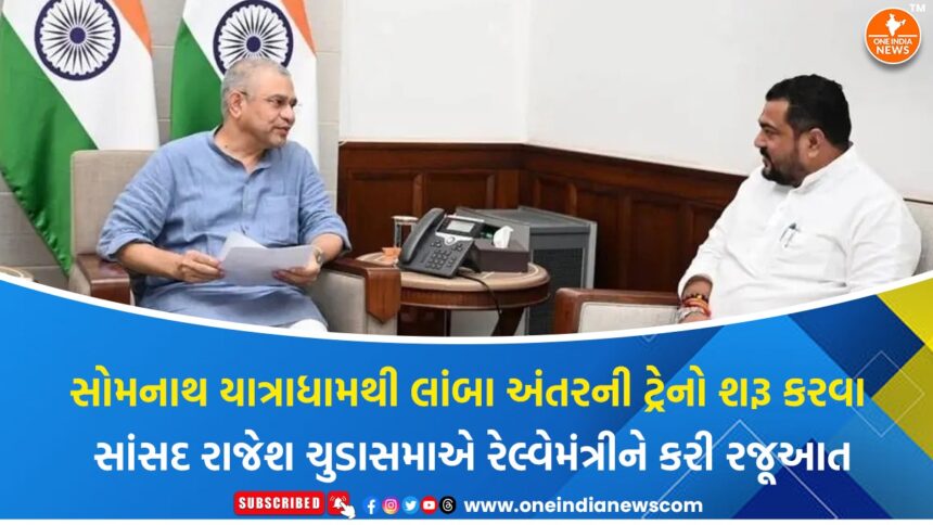 સોરઠના સાંસદ રાજેશ ચુડાસમાએ સોમનાથ યાત્રાધામથી લાંબા અંતરની ટ્રેનો શરૂ કરવા રેલવે મંત્રી અશ્વિની વૈષ્ણવ સમક્ષ ઉચિત રજૂઆત કરી છે, જેનાથી સોમનાથ અને આસપાસના પર્યટન અને તિર્થસ્થળોને વધુ બળ મળી શકે છે. નવી દિલ્હી ખાતે રેલવે મંત્રીને રૂબરૂ મળીને સાંસદે રેલવે સેવાઓને લઈ સત્તાવાર રીતે વિસ્તૃત માહિતી આપી અને માંગણીઓ રજુ કરી.