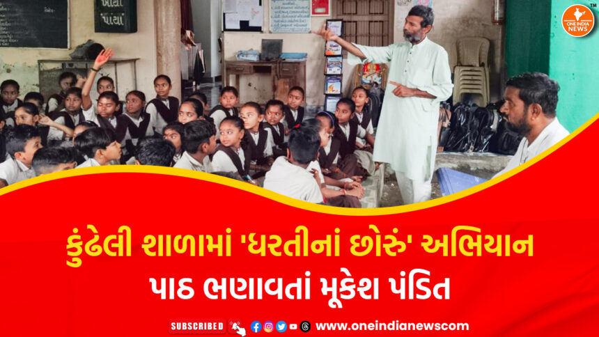 કુંઢેલી ગામે શાળામાં ‘ધરતીનાં છોરું’ અભિયાન પાઠ ભણાવતાં મૂકેશ પંડિત દ્વારા પર્યાવરણ જાગૃતિ સંદર્ભે બાળકો સાથે સંવાદ યોજાયો હતો.