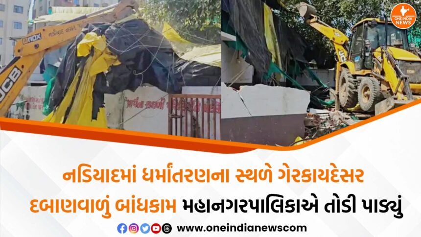 નડિયાદમાં ધર્માંતરણની પ્રવૃત્તિના મામલે મોટી કાર્યવાહી કરવામાં આવેલ છે, જેમાં જે જગ્યા પર ધર્માંતરણની ગેરકાયદેસર કામગીરી ચાલતી હતી, ત્યાં નડિયાદ મહાનગરપાલિકા દ્વારા ગેરકાયદેસર દબાણ દૂર કરાયું છે.