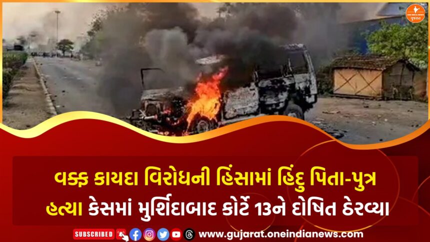 કેન્દ્ર સરકારે પસાર કરેલા વક્ફ કાયદાના વિરોધની આડમાં પશ્ચિમ બંગાળના મુર્શિદાબાદ જિલ્લામાં થયેલી હિંસક ઘટનાઓ દરમિયાન હિંદુ પિતા-પુત્રની કરાયેલ નિર્મમ હત્યાના મામલે ટ્રાયલ કોર્ટે 13 આરોપીઓને દોષિત ઠેરવ્યા છે. આ કેસમાં સોમવારે (22 ડિસેમ્બર) ચુકાદો સંભળાવવામાં આવ્યો હતો, જ્યારે દોષિતોને સજા મંગળવારે (23 ડિસેમ્બર) સંભળાવવામાં આવશે.