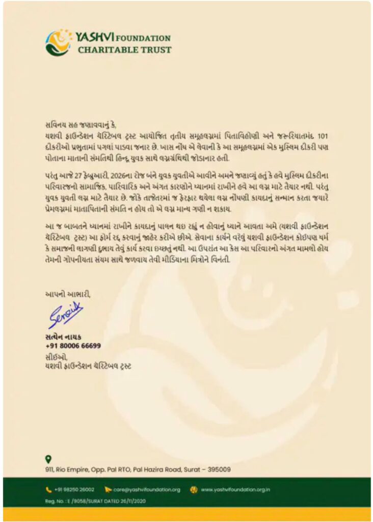 વિવાદ વધતા યશવી ફાઉન્ડેશન ચેરિટેબલ ટ્રસ્ટના CEO સત્યેન નાયકે સત્તાવાર અખબારી યાદી જાહેર કરી હતી. તેમણે જણાવ્યું હતું કે આ સમૂહલગ્નમાં એક મુસ્લિમ યુવતી તેની માતાની સંમતિથી હિન્દુ યુવક સાથે લગ્ન કરવા જઈ રહી હતી. પરંતુ 27 ફેબ્રુઆરીએ યુવક-યુવતીએ ફાઉન્ડેશનને જાણ કરી કે યુવતીના પરિવારજનો હવે સામાજિક અને વ્યક્તિગત કારણોસર આ લગ્ન માટે તૈયાર નથી. જોકે યુવક અને યુવતી હજુ પણ લગ્ન માટે મક્કમ હોવાનું જણાવાયું છે.