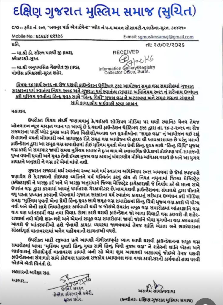 દક્ષિણ ગુજરાત મુસ્લિમ સમાજના આગેવાનો દ્વારા જિલ્લા કલેક્ટર અને પોલીસ કમિશનરને લેખિતમાં રજૂઆત કરવામાં આવી હતી. તેમની દલીલ હતી કે દરેક વ્યક્તિને પોતાની પસંદગી મુજબ લગ્ન કરવાનો અધિકાર છે, પરંતુ જાહેર સમૂહલગ્ન કાર્યક્રમમાં હિન્દુ વિધિ દ્વારા મુસ્લિમ યુવતીના લગ્ન કરાવવું Gujarat Freedom of Religion (Amendment) Act 2021નું ઉલ્લંઘન ગણાય છે. સમાજના પ્રતિનિધિઓએ ચિંતા વ્યક્ત કરી હતી કે આવી ઘટનાથી શહેરના શાંતિપૂર્ણ વાતાવરણ અને સામાજિક સુમેળ પર અસર પડી શકે છે.